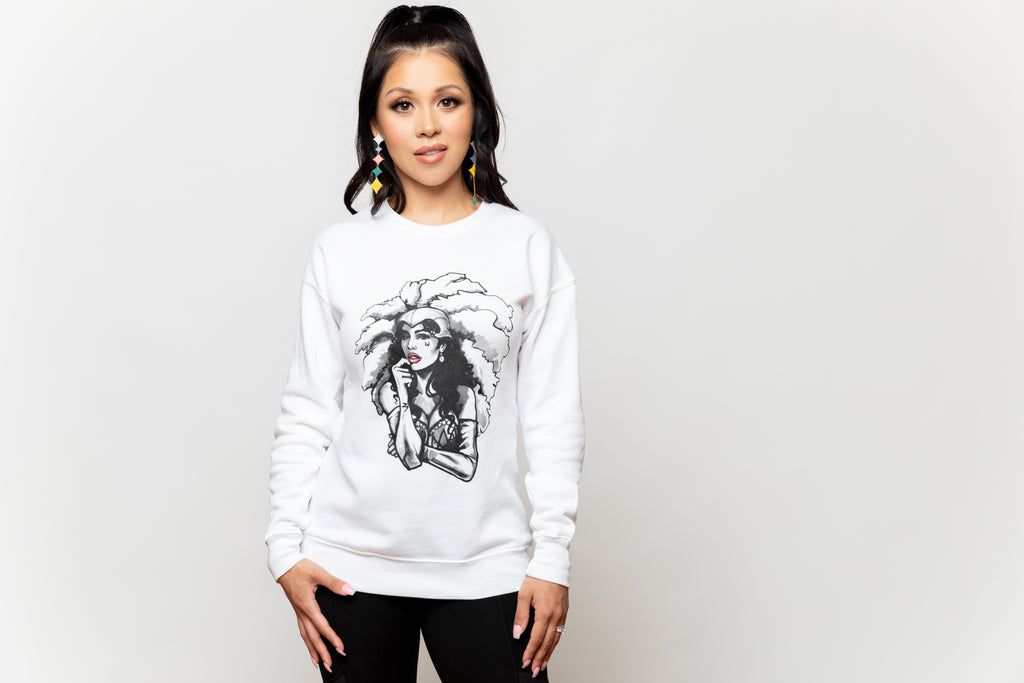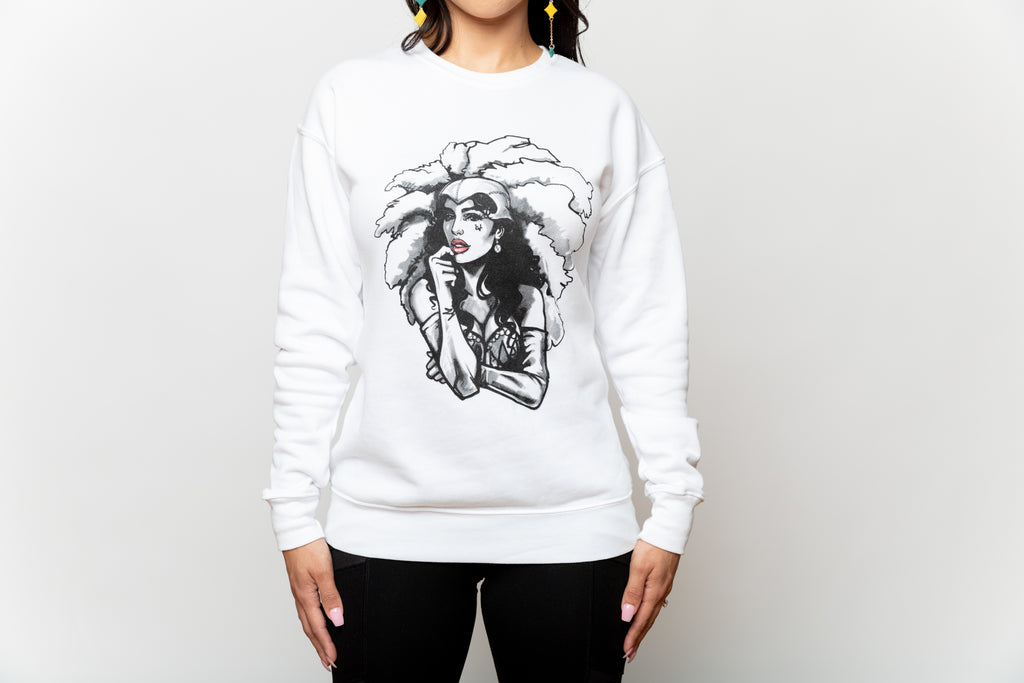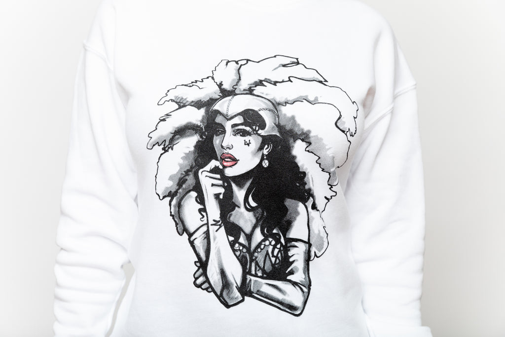Our Vegas Showgirl makes her second appearance on this light weight fleece pullover sweatshirt. The perfect addition to your winter wardrobe. And reppin' your city will never go out of style.